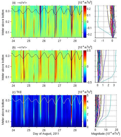 Reynolds stress and turbulent kinetic energy profiles near bed: (a) east–west component, (b) north–south component, and (c) turbulent kinetic energy (TKE). Black and white solid lines in the left panel indicate the sea level variation.