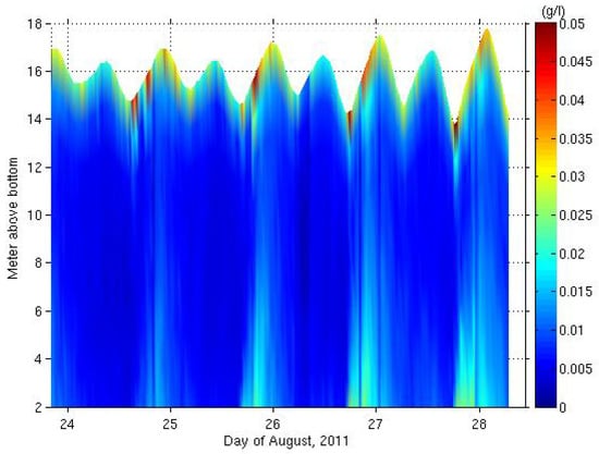 Below the surface layer, for example, around 10–12 mab, the SSC was mostly less than 0.01 g/L except during the second flood tide of each day. However, the SSC in the bottom layer suddenly increased and appeared to propagate into the higher layers whenever the surface freshwater was discharged. For example, SSC greater than 0.02 g/L (light green in Figure 6) reached above 6 mab during 25–27 August. In the previous section, we saw the rapid increase of bottom flow speed and stress-related terms (see Figure 4 and Figure 5), and this kind of change in the physical factors could induce erosion of bottom sediments if the bed of this area consisted of very fine sediment such as silt, clay, or mud. According to Kim et al. [] and Williams et al. [], the sediments of this estuary consist mainly of silt–clay mixtures in which silt is distributed in the shallow areas and clay exists in the relatively deep areas of the central estuary. Certainly, the bed shear stress observed during the freshwater discharge (see Figure 5) can resuspend the fines high into the water column (Figure 6). Furthermore, Bang et al. [] simulated sediment transport by using a numerical model, and showed that the discharge-induced estuarine circulation could cause overall silt-size sediment deposition and sustained suspension of clay sediment.