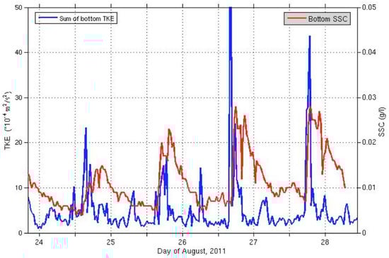 Comparison between the turbulent kinetic energy (TKE) and suspended sediment concentration (SSC) changes in the bottom boundary layer.