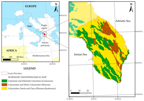 The Salento Peninsula is located in the southeastern part of Puglia region (Southern Italy) and extends from Ionian to Adriatic Sea (Figure 1). It covers 2760 km2, and its limits roughly coincide with those of Lecce Province. The Salento peninsula belongs to the Apulian carbonate platform that is composed by well-bedded succession of Jurassic-Cretaceous carbonate rocks, with a thickness varying from about 3–5 km. The geological basement of the Salento Peninsula is composed by limestone and dolomitic limestone of Cretaceous age, which outcrop in large areas (Figure 1). The covers are characterized by clay, sand and calcarenite of Miocene to Pleistocene age [39]. The basement is characterized by structural highs and lows separated by sub-vertical normal, strike-slip and oblique-slip faults of Plio-Pleistocene age, striking NNW–SSE and subordinately NW–SE [40].