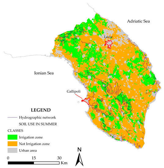 Starting from the 1960s, population began growing with a concurrent economic development mainly based on tourism, agriculture and small family-size manufacturing activities. Due to the high permeability of karst surface, the region cannot rely on superficial waters: thus, these changes were totally supported by the availability of groundwater, which still represents the unique water resource to satisfy drinking and, especially, irrigation demand. Starting from the 1960s, after the onset of deep drilling techniques, which allowed exploiting the carbonate karst coastal aquifer, thousands of authorized and unauthorized irrigation wells exploit groundwater. Exploitation continuously increased in the time, causing a relentless increase of salinization. Figure 2 shows the earliest distribution of irrigation, not-irrigation and urban zones for the Salento Peninsula referred to the summer season 1997 (data on land use are from SIGRIA—Information System for Water Management for Irrigation [44].