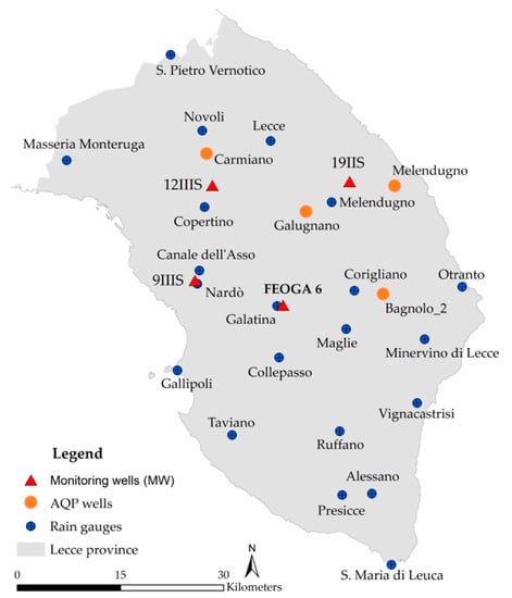 Monthly average temperatures and rainfall data for Salento peninsula were provided by the Civil Protection of the Puglia Government [45]. Figure 3 shows the location of considered gauges, while in Table 2 their main features are summarized.