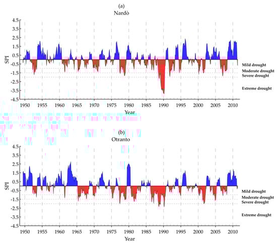 As for the rainfall, the percentage of drought periods is calculated for each station with reference to both the whole period 1949–2011, and two sub-periods 1949–1979 and 1980–2011. In the first case, the percentage of droughts refers to the number of years of mild, moderate, severe and extreme droughts on the total number of values of the reference period (Table 6). This percentage is lightly greater than 50% for all stations, reaching the highest value in the station of Otranto (54.8%); the percentage for the Nardò station does not show any significant discordancy (50.2%).