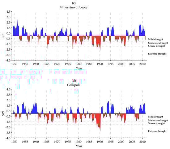 SPI in the period 1949–2011, evaluated, for (a) Nardò, (b) Otranto, (c) Minervino di Lecce and (d) Gallipoli. The year marks are centred on 1 July of each year.