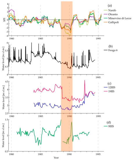 SPI calculated for precipitation measured between 1979–1995 at the Nardò, Otranto, Minervino di Lecce and Gallipoli rain gauge stations (a) compared to the water level time series over 1979–1994 of the Feoga-6 (b), 12IIIS and 19IIS (c), and 9IIS (d) MWs respectively. The coloured bar covers the period 1 January 1989–31 December 1990; the date ticks are centred on 1 July of the correspondent year. The location of gauge stations and MWs is in Figure 3.