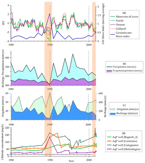 SPI (a) calculated for precipitation measured between 1980–2002 at the Nardò, Otranto, Minervino di Lecce and Gallipoli rain gauge stations compared to (a) GWS, (b) yearly precipitation, evapotranspiration and (c) irrigation and recharge. GWS and data shown in (b) and (c) refer to the entire Salento aquifer. (d) Chloride concentrations measured in samples from AqP wells tapping groundwater for potable use. The coloured bars cover the periods 1 January 1989–31 December 1990 and November 2001–August 2002; the date ticks are centred on 1 July of the correspondent year. Location of gauge stations and AqP wells is shown in Figure 3.