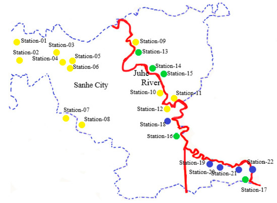 In Figure 1, there are 22 monitoring stations. The stations marked in green are the stations for the construction of sewage villages along the banks of the river, the yellow are the stations with more pollution on the Juhe River, and the blue are the stations in the buffer zone of the provincial boundary, which require higher water quality and is greatly affected by upstream water quality.