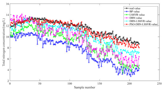 Establish prediction models for water quality time series. For the BP prediction model, the structural parameter is 8-13-1, where the number of input layer neurons is 8, the number of hidden layer neurons is 13, the number of output layer neurons is 1, the learning rate is 0.001, the learning target is 0.01, and iterate 3000 times. The learning parameters C and δ of the LSSVR model are optimized and selected by the grid search method, and the iteration step is 1. We establish a double hidden layer DBN network structure composed of RBM1 and RBM2, it is found that the structural parameter of 8-12-4-1 is the best after many iteration experiments, where the number of visible layer neurons is 8, the number of RBM1 hidden layer neurons is 12, the number of RBM2 hidden layer neurons is 4, and the LSSVR output layer is 1. The RBM learning rate is set to 0.05, the number of iterations is 3000, and the population size is set to 50 in the PSO algorithm. After many experiments, it is found that the optimal parameter combination of LSSVR is C = 96 and δ = 1.5, then utilized the optimal prediction model to predict the total nitrogen (TN) content.
