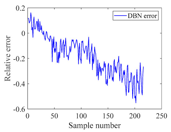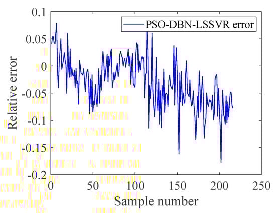 Figure 7, Figure 8, Figure 9, Figure 10 and Figure 11 show the prediction relative error curves of the models, which can be seen that the relative errors of the prediction results of the BP network, LSSVR, and DBN network are relatively large, and the error range was −0.8~0.2. Most of the results of the combined model DBN-LSSVR were maintained at −0.2~0.1, and a small part of the prediction results had large errors. The PSO-DBN-LSSVR model proposed in this paper had a relatively small prediction error, which was closer to 0, basically fluctuating around 0, and had better prediction accuracy.