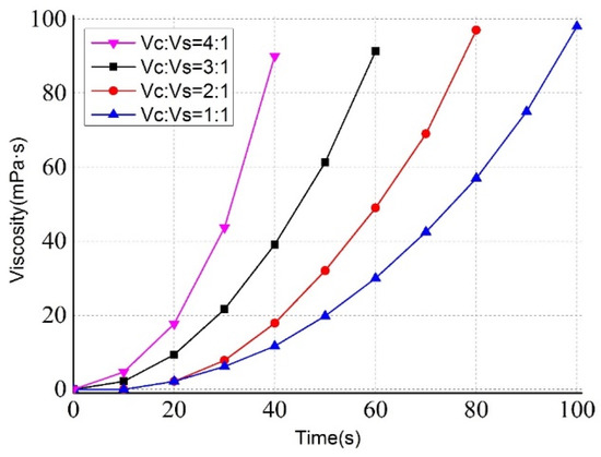 The cement in the experiment was 32.5 R ordinary Portland cement. The water/cement ratio of the cement grout was 1.0. The modulus of the sodium silicate solution was 3.0. The Baumé degree was 40. The volume ratios of the cement grout and sodium silicate solution were 1:1, 2:1, 3:1, and 4:1. The gel time of the C-S grout was measured using SV-10 and SV-100 sine wave vibration viscometers (A & D Company, Tokyo, Japan). The vibration viscometers used are depicted in Figure 1. The viscosity changes with time for different mixture ratios of C-S grout are shown in Figure 2.