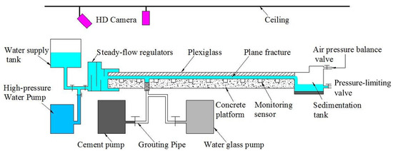 The quasi-three-dimensional fracture grouting simulation test platform developed by Shandong University was used in the experiment. The fracture grouting simulation test platform consisted of five parts: a fracture replica, a data acquisition system, a flowing water generation system, a grouting system, and a real-time video recording system. The schematic of the fracture grouting test platform is shown in Figure 3.