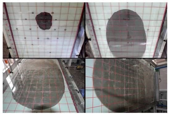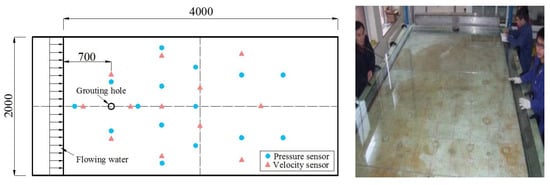 The fracture replica of the grouting test platform consisted of rock-like materials and toughened glass. The fracture replica was transparent and had a high compressive strength. The fracture replica was 4000 mm long and 2000 mm wide, with a varying aperture width of 1–30 mm according to the experimental design requirements. The width of the fracture plane could be adjusted by symmetrically changing the boundary position. The fracture plane had a varying width of 500–2000 mm. The initial velocity of flowing water could be adjusted in the range of 0–0.4 m/s. A fiber optical pressure sensor was arranged on the bottom surface of the fracture replica. A grouting hole with a diameter of 20 mm was drilled at the fracture’s bottom surface, at a distance of 700 mm from the entrance of the flowing water.