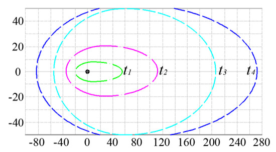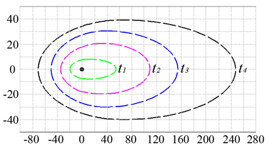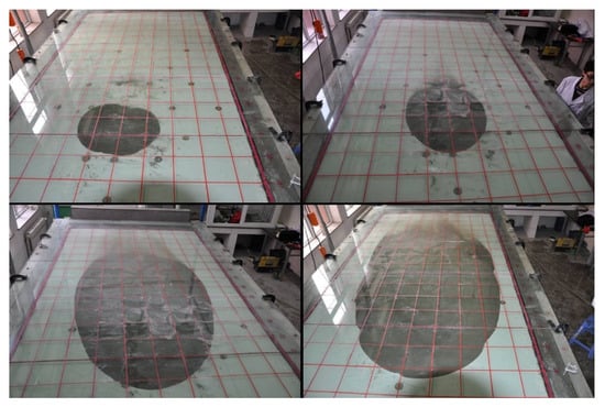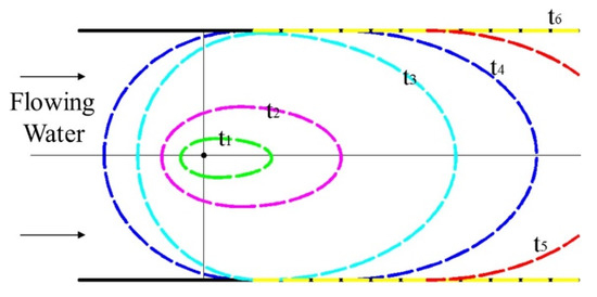 Based on the diffusion progress of C-S grout with flowing water, the grout diffusion traces at different moments were plotted. By analyzing and comparing the grout diffusion traces, we found two types of typical diffusion patterns. In the two typical diffusion cases, the grout traces exhibit identical laws, i.e., the diffusion paths of the slurry at arbitrary times are asymmetric ellipses that change with time. The two diffusion patterns are described in the following: