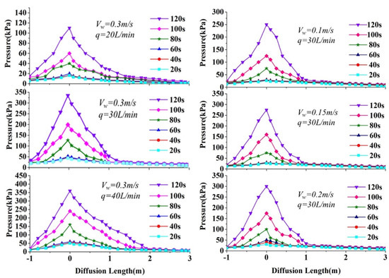 The pressure field is one of the most important physical laws in the grout diffusion process. The variation of the grouting pressure field with different grout takes and initial velocities of the flowing water were studied with a constant fracture aperture of 5 mm. In the experiment, it is difficult to precisely control the grout take and velocity of flowing water. An error rate of <5% in the velocity of the flowing water and grout take is acceptable. The temporal and spatial variations of the fluid pressure on the x = 0 line are shown in Figure 9 (where the initial water velocity is Vw and the grout take is q).