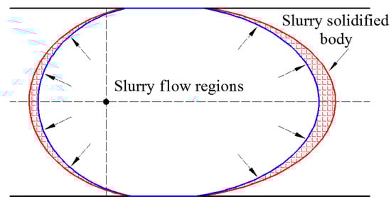The sealing of quick-setting grout in rock fractures with flowing water is always accompanied by a phase change and diffusion of the grout. According to Figure 10, the best time for fracture sealing is t3–t5. When the formation of the grout-solidified body is earlier than t3, the grout cannot diffuse to the fracture boundary parallel to the water flow, which leads to failure of the fracture sealing. When the formation of the solidified plugging body is later than t6, the grout cannot form an effective sealing body, which can result in excessive grout loss. Therefore, the effective solidification sealing body can only be formed from t3 to t5 and the sealing process shown in Figure 11 and Figure 12 will occur.