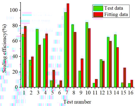 where SE is the sealing efficiency (in percent), W is the fracture plane width (in meters), A is the fracture aperture (in millimeters), V is the initial water flow velocity (in cm/s), M is the mixture ratio of C-S grout, and T is the grout take (in L/min). The correlation coefficient of Equation (2) was 0.912. The contrast between experimental data and fitting data are shown in Figure 13. Equation (2) could play a significant role in practical engineering.