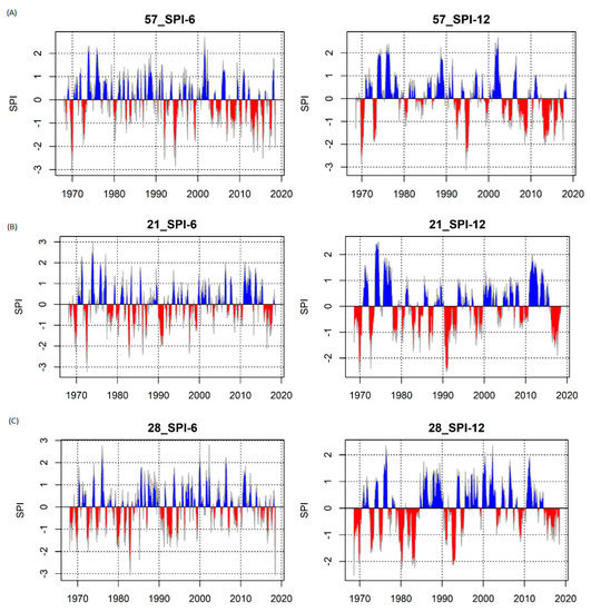 Standardized Precipitation Index (SPI time series for selected climatic rainfall districts in (A) north-western, (B) south, and (C) south-eastern regions of the Eastern Cape province. Left panel: SPI-6 and right panel: SPI-12. The blue and red colors represent wet and dry epochs, respectively.