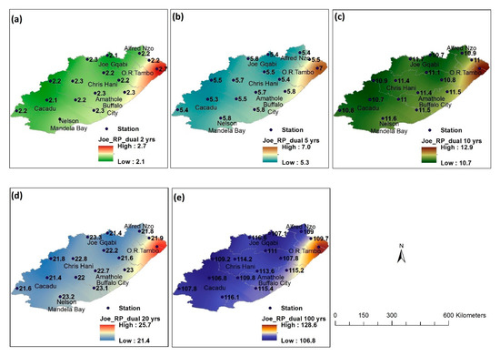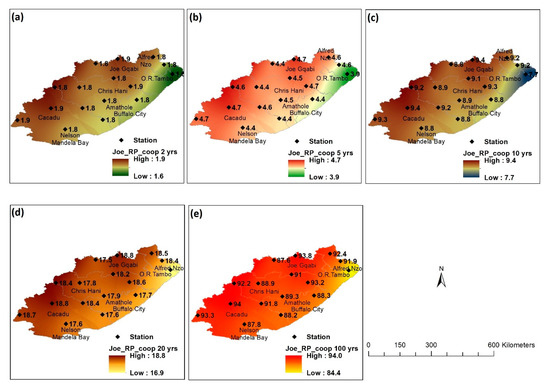 Given that drought is a multivariate event, it is, therefore, best to fully account the inherent risks using a combination of two or more drought monitoring indicators. In the present study, the drought risks were assessed using the joint return periods derived from the Joe (and Gaussian, not shown) copula functions. In this case, the copula functions were calculated from the marginal distributions fitted by the two drought monitoring indicators i.e., drought duration and severity e.g., the SPI-6. The spatial distribution of joint return periods for the dual and cooperative cases (see Equations (10) and (11)) alongside the 2-, 5-, 10-, 20- and 100-year univariate return period are given in Figure 7 and Figure 8, respectively. As depicted in Figure 7, the multivariate return period for the dual case was always longer across all the selected univariate return periods manifesting an overestimate of the drought risks. The dual (conjunctive) case contrasts cooperative multivariate case as shown in Figure 8, a consequence of the formulations given in Equations (10) and (11). In terms of drought risk analysis, the study area exhibited a noticeable north-west to south-east gradient with Buffalo City, Tambo and Alfred Zoo regions determined to have higher/lower risks in terms of the conjunctive/cooperative multivariate drought risk (copula) probability index.