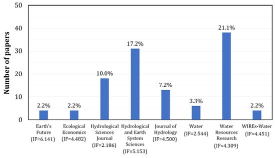 Number and percentage of socio-hydrology papers published in different journals. IF values show the impact factors of the journals in 2019 according to the Clarivate Analytics’ Journal Citation Report. Only journals that have published at least four papers are shown. In our literature search, we first searched for the keywords “socio-hydrology”, “socio-hydrology”, “socio hydrology”, “socio-hydrologic”, “socio hydrologic”, “socio-hydrologic”, “socio-hydrological”, “socio-hydrological”, and “socio hydrological” in the WoS database, resulting in 278 peer-reviewed journal papers. After reviewing these papers, we discarded those which did not focus on topics that are directly related to socio-hydrology. Our final database includes 180 papers, cited 3756 times overall based on WoS citation report, with 593 contributing authors.
