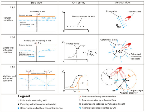 As a result, local high-concentration pollution sources might be ignored for inadequate point-scale sampling. It is not feasible to backtrack the source zone using the concentration distribution obtained from an IPT. In view of the weak hydrodynamic conditions and irregular contamination distribution in low velocity flow fields, here we develop a source identification method based on an artificially enhanced catchment. The artificial source–sink relationship between a pumping well (artificial sink) and a source zone (unknown source) is established to identify the position of the source. Concentration time series and well flow theory are used to calculate the distance from the unknown source to the pumping well. The potential source is subsequently located by intersecting the catchment areas obtained from multiple pumping wells. This article shows the theory, steps, limitations, and field test results of the new method.