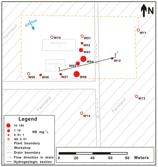 Groundwater samples were taken at the site using existing monitoring wells. QED low-flow sampling with Micro-Purge equipment was used for groundwater sampling in the wells. Eight of 14 wells had detectable levels of NB. Point-scale sampling results indicated a large concentration gradient ranging from 0.001 to 62.3 mg/L within a relatively short distance of about 15 m. The high concentrations of NB were found emerged in wells W03, W04, W05, and W06. These four wells were located in the eastern part of workshops 1 and 2. The concentration of NB in the remaining wells was less than 1.00 mg/L. A site map with NB concentrations is shown in Figure 3.