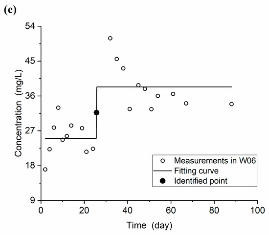 C-t series of pumping well W04 can be seen from Figure 4a. The initial NB concentration of well W04 under enhanced condition was 62.11 mg/L, which was the highest among the three pumping wells. According to the trend of measured sampling data, the pumping duration of well W04 could be divided into three phases. Phase one contained the period from pumping initiation to day 14; concentrations of NB in well W04 fluctuated during this stage. At day 14, the concentration of NB dropped to a minimum value of 28.29 mg/L during the whole catchment process. This stage indicated that the concentration of NB in the zone outside the steady catchment area was lower than the initial concentration of well W04. The second stage was from day 15 to day 67 of the catchment process. The concentration of NB in well W04 increased during this period. At day 48, the concentration of NB returned to the initial concentration level. From day 48 to day 67, the concentration of NB increased rapidly from 60.73 to 117.91 mg/L and reached the maximum concentration for the entire pumping duration. This rapid rise indicated the existence of a source with a higher concentration. From day 67 to the end of the test, the NB concentration in well W04 varied from 74.67 to 117.91 mg/L. Based on C-t series fitting results (Figure 4a), the ta of well W04 was 56 days. The distance from well W04 to the potential source was 7 m as calculated by Equation (6). The calculation result considering the influence of the retardation factor lR was 5.6 m.