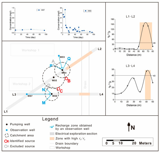 The results of the electrical prospecting are labeled in Figure 5. The area with a high ratio of rb/rp demonstrated that the zone near the drain was a high level of overall pollution. We compared the identified source position with the high rate of rb/rp on the electrical prospecting lines. Point B matched well with the high rate of rb/rp of line L1-L2. The northeast position of W04 (Q-B) was identified as a heavily polluted area (potential source). This needs to be confirmed first with further investigation and in the remediation phase. The high rate of rb/rp on line L1-L2 (about 180) was much higher than the value of line L3-L4 (about 50), which indicates that the total magnitude of the source that recharges well W04 (Q-B) was much higher than that of well W06 (C-M).