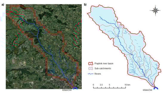 Orthophoto map of the Prądnik river basin (a) and its subcatchments (b).