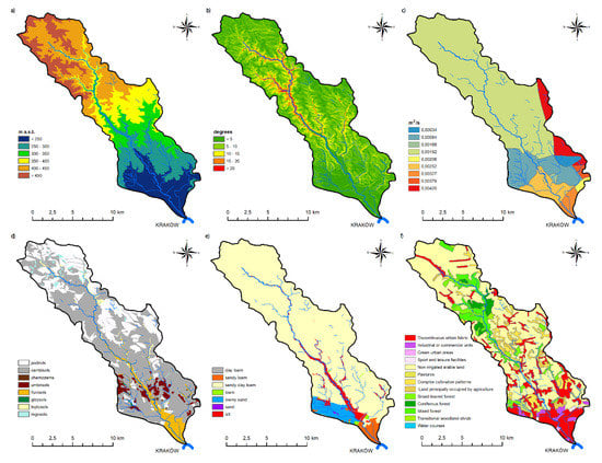 Landscape attributes of the Prądnik river basin: (a) hypsometry; (b) slope inclination; (c) bedrock transmissivity; (d) soil types; (e) soil texture; (f) land use/landcover (CLC 2018).