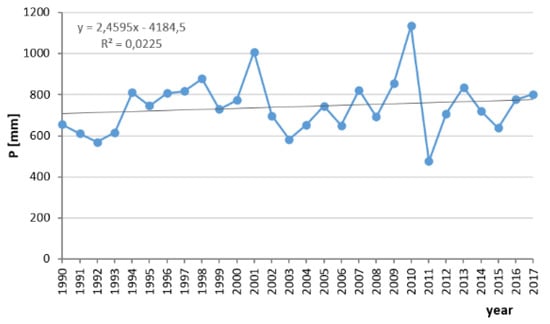 The annual precipitation in the period 1990–2017 for the Prądnik basin was 743 mm and was higher than the normal precipitation for Poland. According to Czarnecka and Lencewicz [] the annual normal precipitation in Poland for the period 1951–2000 was 594 mm. Higher precipitation in the Prądnik basin results from the location of the catchment area on the higher part of the Krakowsko–Częstochowska Upland. The longtime course of the precipitation is characterized by a significant fluctuation of the values. However, the statistical trend has not been significant (Figure 3).