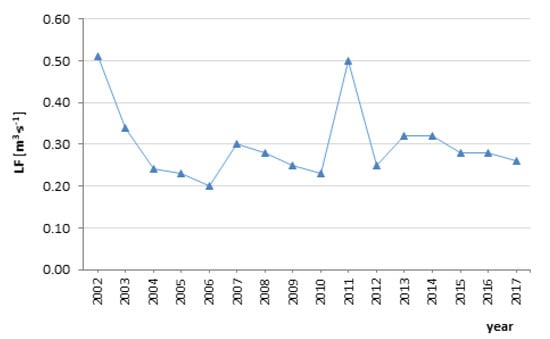 Based on the results summarized in Table 5 it was found that, for the analyzed period, there has not been a significant statistical trend of low flows in the Prądnik basin, but a decreasing of low flow is visible over the 2002–2017 period. This is confirmed by the values of the probability p for obtained test statistics. In each case the probability p was lower than significant level (α = 0.05). The lack of statistically significant trends means that the investigated random variables derive from the same general population. Thus, in the analyzed multiyear period, no factor appeared to be significantly affecting the processes that shape low flows. The similar results of trend analysis for low flows, in other river basins of the upper Vistula basin were obtained by Młyński et al. []. The results obtained from the research can be related to the outcomes regarding the trend analysis of the factors significantly affecting the flow of waters in the river basins of the Upper Vistula water region. Results brought by Niedźwiedź et al. [] presented no significant trends concerning the indicators describing daily precipitation. Analyses carried out by Falarz [] confirmed the lack of significant trends for the duration of snow cover remaining in mountainous catchments. The supply of rivers in the Upper Vistula water region comes primarily from snowmelt runoff and from precipitation—hence it is assumed that the rhythm of effluents is repeated by the low flows. The lack of significant trend of low flow in the Prądnik river basin is caused by the high percentage of natural land use in the upper part of the catchment and the positive value of climatic water balance. In result, the upper part of the Prądnik river basin has a higher water storage potential that moderately affects the impact of climatic conditions on flow regime. Higher water storage potential in the upper part of the study area is linked with the higher value of LHP compared to rest of the river basin [].