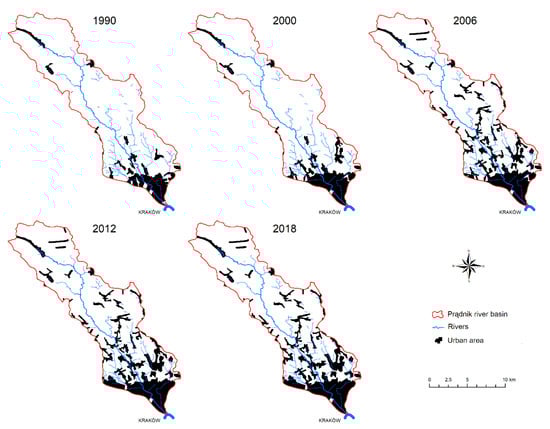 Mapping the change in urban extent across the Prądnik river basin from CORINE Landcover inventory over the period from the 1990’s to 2018 confirmed that the study area has undergone a significant increase of the impervious areas (Figure 5). The historical change in urban development and related impervious cover illustrates the quantitative influence of the urbanization across the study river basin over the period 1990–2018. Within the Prądnik river basin, the impervious cover rose considerably from 6.7% to 11.5%, with the greatest development seen in 2006 and 2012. For further data on the change of impervious cover see Table 6; the presented area of impervious surfaces is after correction factor (cf) was used. With all estimates of historical urban extension and related impervious cover, there is some associated uncertainty. As seen from Table 6 there is uncertainty of CLC 2000 data. Compared to CLC 1990, there is a deficiency of 234 ha within the CLC class 112—discontinuous urban fabric. The total reliability of CLC 2000 is 87.0% ± 0.8%; within the class 112, there is the highest class reliability >95.0% [].