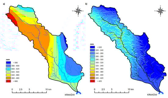 (a) Mean annual precipitation and (b) annual climatic water balance in the Prądnik river basin.