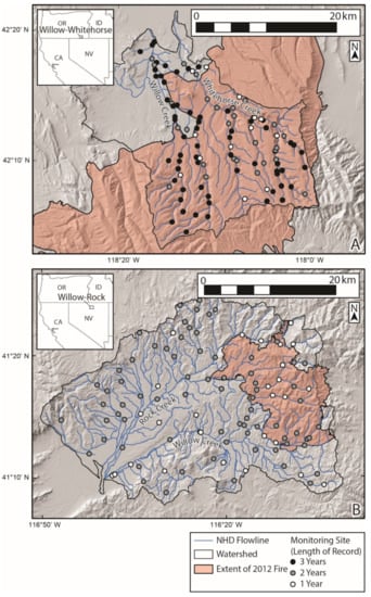 We studied two stream networks located within the northern and central Great Basin, USA [,] (Figure 1). These stream networks were selected for study because both are classified as critical habitats for Lahontan cutthroat trout, a threatened subspecies of inland cutthroat trout [,,]. The Willow–Whitehorse (WW) stream network drains into pluvial Lake Coyote [] in southeastern Oregon, and the Willow–Rock (WR) stream network drains into the Humboldt River in the Lahontan Basin of north-central Nevada. In this cold desert region, winters bring freezing temperatures, and precipitation often falls as snow []. Mean annual precipitation estimated by PRISM (Parameter-elevation Regressions on Independent Slopes Model) was greater in the WW watershed (390 mm) compared to the WR watershed (339 mm) for the period from 1981 to 2010 []. Between 2004 and 2017, mean snow water equivalent (SWE) on May 1 estimated by SNODAS (Snow Data Assimilation System) [] ranged from 0 mm in the lower elevations of both the WW and WR watersheds to 45 and 320 mm in higher elevations of the WW and WR watersheds, respectively. During the warm and dry year of 2015, no snowpack on May 1 was present in WR and the maximum May 1 SWE in the WW watershed was 28 mm. Warm, dry summers can lead to warm (>20 °C) stream temperatures and the loss of surface stream flows [,,]. The dominant land use of the contributing watersheds to these stream networks includes mining, livestock grazing (cattle and sheep), and irrigation to provide additional forage for livestock [,,]. Limited surface water withdrawal occurs within both watersheds. Both stream networks were affected by wildfires in the summer of 2012, including the Holloway Fire and Willow Fires in WW and WR, respectively (Figure 1). Wildfires can cause dramatic changes in land cover, particularly riparian vegetation, which can lead to changes in stream temperatures, and potentially stream flows []. More detailed descriptions of each stream network can be found in [] (WR) and [] (WW).