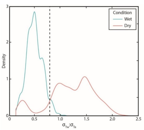 Distributions, represented with kernel density estimate, of the ratios of weekly moving averages of the daily standard deviations of water temperatures (σTw) to air temperatures (σTa) during April through August in Willow–Whitehorse (WW) []. Wet and dry conditions were verified by using electrical resistors. The dashed vertical line represents a cutoff of σTw:σTa = 0.8.