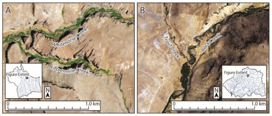 National Agricultural Imagery Program (NAIP) orthoimagery of riparian corridor of (A) Whitehorse Creek at Fifteenmile Creek confluence (WW watershed) and (B) Rock Creek at Trout Creek confluence (Willow–Rock (WR) watershed).