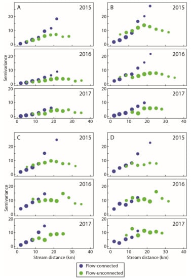 Torgegrams of mean monthly stream temperature for the four time periods (MayTw, JunTw, JulTw, and AugTw) were evaluated for individual years from 2015 through 2017 (Figure 4). For flow-connected sites, semivariance of MayTw, JunTw, JulTw, and AugTw was low at short hydrologic separation distances and increased with distance, indicating a broad-scale trend in water temperature. Conversely, spatial autocorrelation was evident among flow-unconnected sites in May and June and leveled off at relatively short (~15 km) separation distances, indicating smaller-scale patchiness in water temperature. Spatial dependence among flow-unconnected sites was more pronounced in May and June (Figure 4A,B) and became progressively less apparent in July and August (Figure 4C,D). These relations were largely consistent across years.