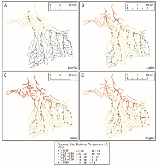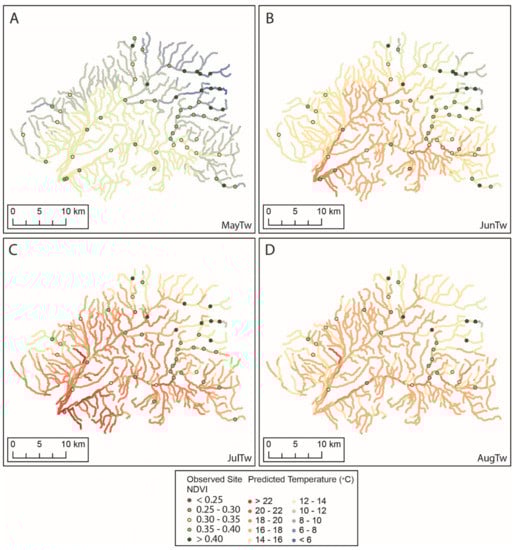 Stream temperatures predicted by SSN models for MayTw (A), JunTw (B), JulTw (C), and AugTw (D) and values of NDVI covariates for the WR watershed. Observation sites are indicated by circles with black outlines and are colored according to the value of NDVIrip covariate. The number of observed sites varies between months because dry sites were excluded from analysis.