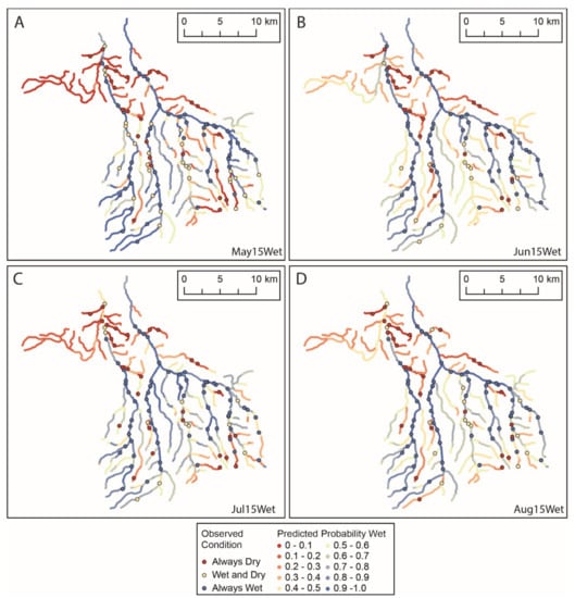 The extent to which stream networks are fragmented depends on the specific ecological responses of interest. The streams that we studied are designated critical habitats for Lahontan cutthroat trout, a threatened species []. The distribution of this species is strongly influenced by water temperature and perennial stream flows [,]. Other species may respond less to temperature and more to the presence of available surface water. We were generally successful in developing models to predict stream temperatures and streamflow permanence. Although we collected high-resolution stream-temperature data within the study networks, predictions of stream temperature were statistically less precise than those for a regional model of stream temperature []. In other words, the finer-grained variability of temperature within local watersheds can be very complex and more difficult to predict than variability at larger spatial extents. This result underscores the importance of considering scale in applying results from regional [] and local (our study) models of in-stream hydrologic responses [] to understand stream-network fragmentation. Measures of model performance for predicting stream temperatures declined from spring (May) through late summer (August), perhaps indicating that as the hydrologic stream network became more fragmented (intermittent), local processes not captured in our spatial covariates were driving localized heat budgets at scales of 10–100 m. In contrast to stream temperature, our predictions of streamflow permanence (probability of drying) were generally much more precise than a regional model of flow permanence [], particularly in June, July, and August (Table 1 and Table 2).