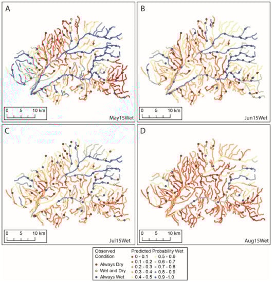 Flow presence predicted by SSN models for May15Wet (A), Jun15Wet (B), Jul15Wet (C), and Aug15Wet (D) and observed wet/dry condition for the WR watershed. Observed sites are outlined in black.