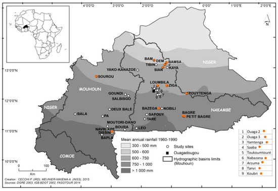 - Sivakumar, M.V.K.; Gnoumou, F. Agroclimatology of West Africa: Burkina Faso; Information Bulletin 23; International Crops Research Institute for the Semi-Arid Tropics (ICRISAT): Hyderabad, India, 1987; Available online: http://oar.icrisat.org/864/1/RA_00104.pdf (accessed on 9 April 2020).