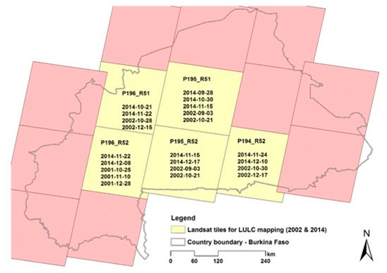 Landsat tiles used for studying land use and land cover (LULC) changes between 2002 and 2014 in Burkina Faso. Dates of acquisition are indicated. Scenes cover geographical locations of all sampled small reservoirs (SRs).
