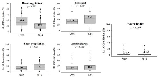 During the same decade, the contributions of the different LULC classes have evolved within 5-km buffer areas around water masses (Figure 7). These changes were not statistically significant (p > 0.1), except for the “dense vegetation” class (Mann–Whitney non-parametric rank-sum test: U = 97.5, p = 0.002) characterized by an important reduction of its contribution (shift of median values from 28.7% in 2002 to 20.9% in 2014).