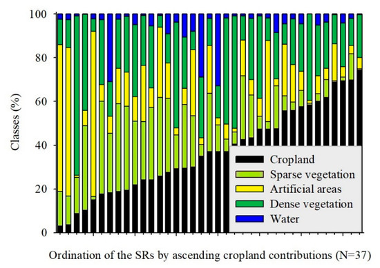 LULC classes repartition within the 5-km buffer areas around SRs (n = 37) in 2014.