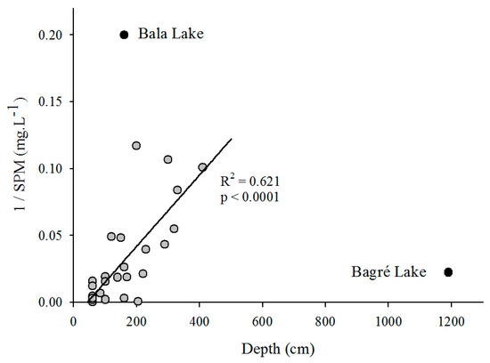 Inverse relationship linking the SPM load and the depth of the studied reservoirs in 2014. The linear regression (grey dots) does not include the Bagré and Bala Lakes (dark dots).
