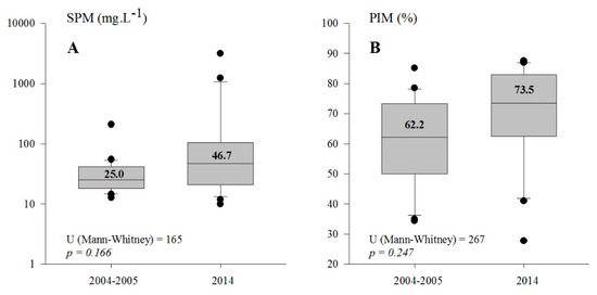 Box-plots of SPM (A; mg·L−1) and PIM (B; %) values in 2004/5 and in 2014, for the 21 water masses that have been sampled at the two periods. The statistics of the Mann–Whitney non-parametric rank-sum tests that compare median values (in bold) for the two periods are indicated.