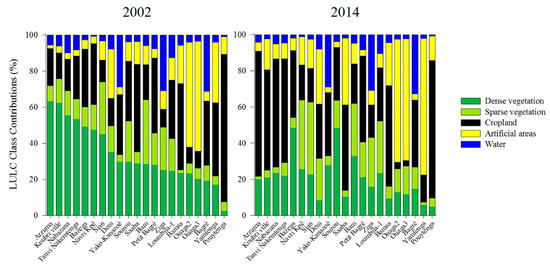 Accuracy assessment of the LULC maps using the independent set of validation data revealed overall accuracies of more than 90% for six out of the 10 classifications and more than 81% for the remaining 4. Generally, classification accuracies were affected by confusion between sparse and dense vegetation on one hand, and cropland and artificial surfaces (especially bare areas) on the other. The latter case can be attributed to the use of images acquired during or after harvest (as was for this study). Indeed, cutting down the stalks of cereals (sorghum, maize) and transporting them for use elsewhere may leave the agricultural fields bare after harvest. This is aggravated as the dry season sets in. Confusion between cropland and vegetation types may also occur because medicinal, sacred, and fruit trees are maintained in croplands [15,68], which leads to mixed pixels. Table S1 (Supplementary materials) presents a summary of the classification accuracies obtained for all 10 classifications. Figure 3 shows box plots of LULC classes around the 37 SRs for 2002 and 2014. For both years, cropland and dense vegetation represent the dominant LULC classes. Cropland areas around SRs increased substantially between the two dates, while dense vegetation witnessed a significant reduction. Marginal but not statistically significant increases were observed for sparse vegetation, artificial surfaces and water bodies (p > 0.01). General trends seem globally persisting with very significant autocorrelations of all the different classes between the two dates (Spearman rank–order correlation coefficients varying between 0.478 and 0.829, p < 0.001). In other words, sites affected by important anthropogenic pressures in 2014 were already affected by important anthropogenic pressures in 2002.