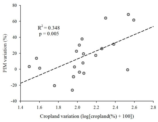 Relationship between the rate of change of the “cropland” class contribution to LULC [log (cropland (%) + 100)] within 5-km buffer areas around water masses between 2002 and 2014, and the rate of change of PIM contribution to the SPM load (%) during the same period.