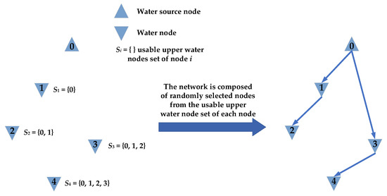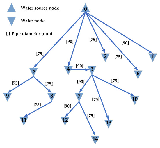 For the pipe network planning problem, current solutions require a preliminary connection diagram of the pipe network corresponding to the actual working conditions of the project and the experience of the design personnel to ensure the single-point water supply principle of a tree-type pipe network [3]. This study introduced the concept of an upper water node into the traditional pipe network planning model and transformed the pipe network deployment planning problem into the selection and combination of water-consuming nodes and their corresponding upper water nodes; this ensured the single-point water supply principle of the tree-type pipe network. Compared to the traditional pipe network deployment method, the improved pipe network planning model does not require the use of a preliminary connection diagram of the pipe network, thereby improving the versatility of the model. The improved pipe network planning model is described below.