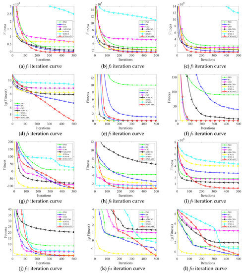 The iterative curves of the mean fitness values of each algorithm based on the 50D test functions are shown in Figure 2, where some results are logarithmic. Figure 2 indicates that, of the three standard algorithms, the CSO algorithm had certain advantages in terms of the convergence speed, but the BA algorithm could obtain better optimization results for multiple functions. When comparing the CSO algorithm to the ICSOAs, the ICSO-a algorithm had certain advantages in terms of the convergence speed and could obtain better optimization results for multiple functions. The ICSO-ASV algorithm had relatively obvious advantages in terms of the solution accuracy and avoiding local optima in comparison to the control algorithms. The optimization curves of the functions f4, f7, f11, and f12 show that, as the number of iterations increases, the ICSO-ASV algorithm did not fall into a local optimum and its solution accuracy could be further improved.